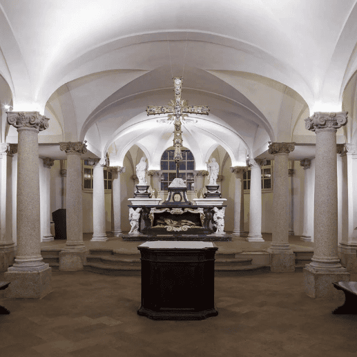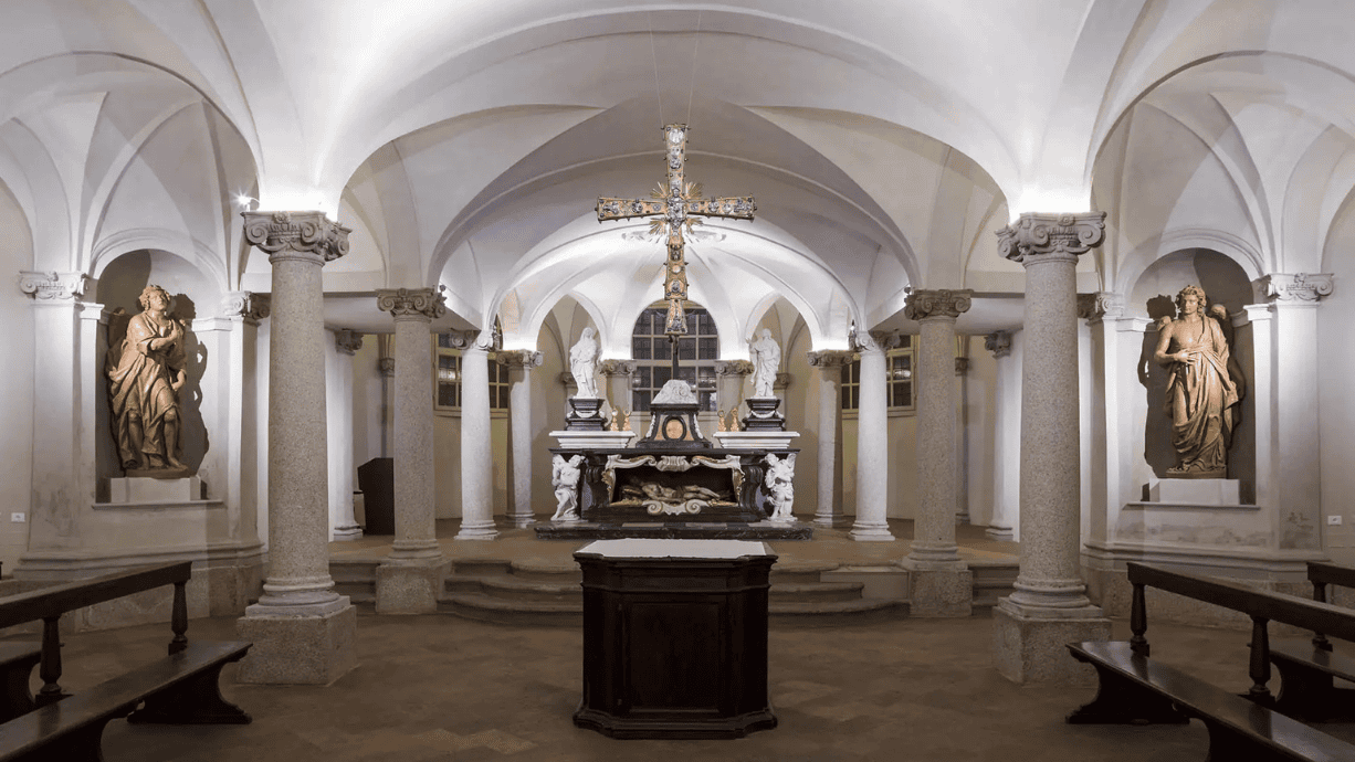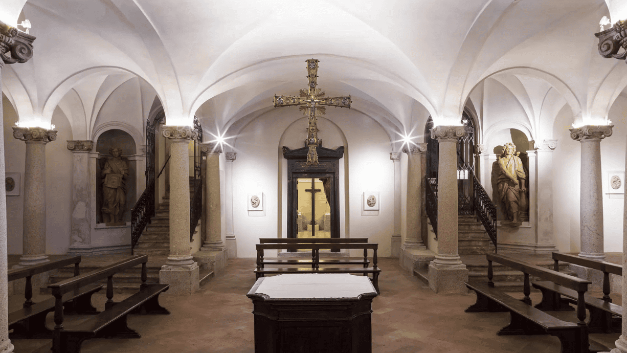 Nella cripta, opere d’arte antica dialogano con installazioni contemporanee, e dal 2020 ospita la Nanda Vigo – Private Collection, con opere di Piero Manzoni, Lucio Fontana, Gruppo Zero e altri grandi artisti internazionali.
